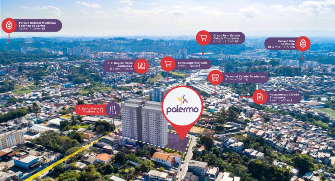 Localizado na Chácara Santa Etelvina, na região da Cidade Tiradentes, o empreendimento oferece praticidade, mobilidade e qualidade de vida. Está próximo ao Terminal Cidade Tiradentes, ETEC Cidade Tiradentes, Extra Supermercado, Poupatempo Cidade Tiradentes, Parque Vila do Rodeio e ao Hospital Municipal Cidade Tiradentes.